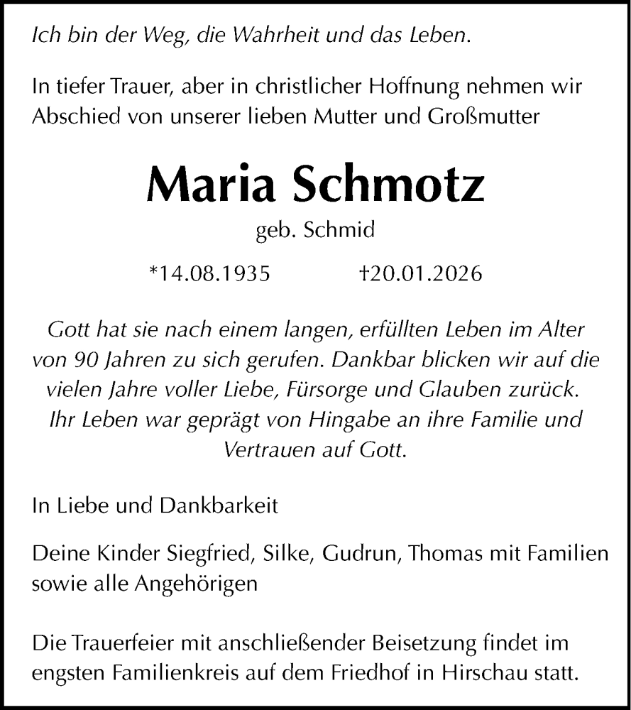 Hier finden Sie alle Traueranzeigen aus der Zeitung, die bisher für Maria Schmotz erschienen sind. Weitere Traueranzeigen, die in der Zeitung erscheinen, werden hier ebenfalls aufgelistet