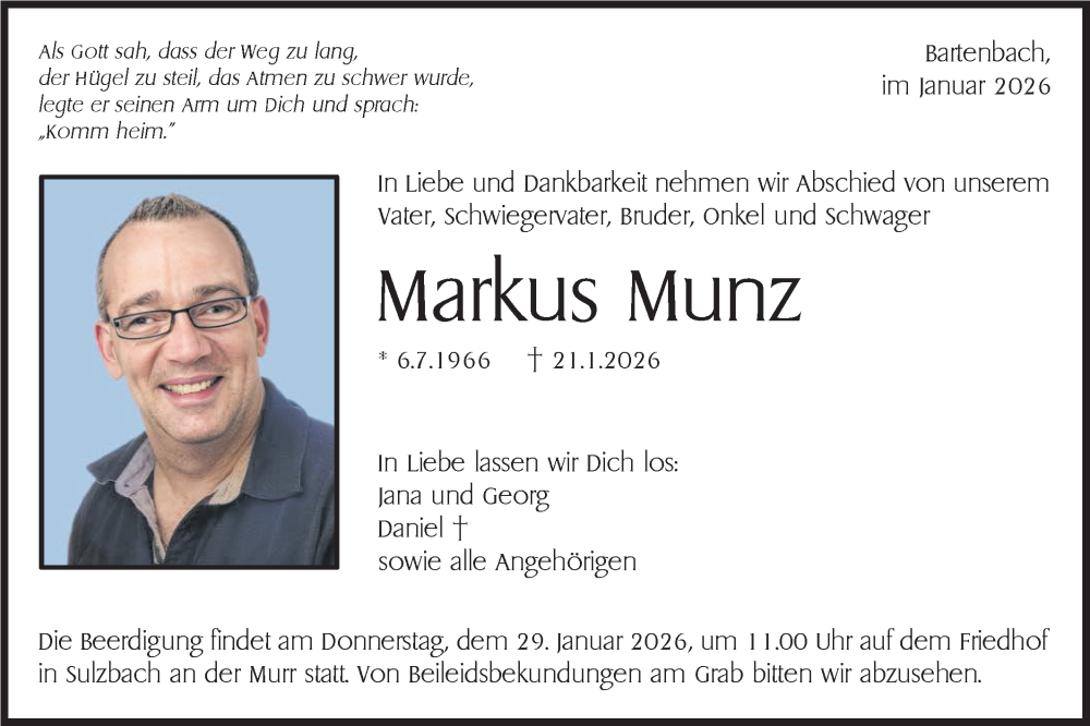 Hier finden Sie alle Traueranzeigen aus der Zeitung, die bisher für Markus Munz erschienen sind. Weitere Traueranzeigen, die in der Zeitung erscheinen, werden hier ebenfalls aufgelistet