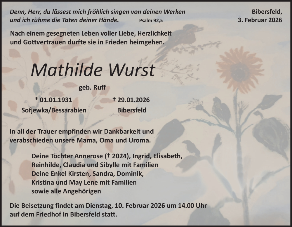 Hier finden Sie alle Traueranzeigen aus der Zeitung, die bisher für Mathilde Wurst erschienen sind. Weitere Traueranzeigen, die in der Zeitung erscheinen, werden hier ebenfalls aufgelistet