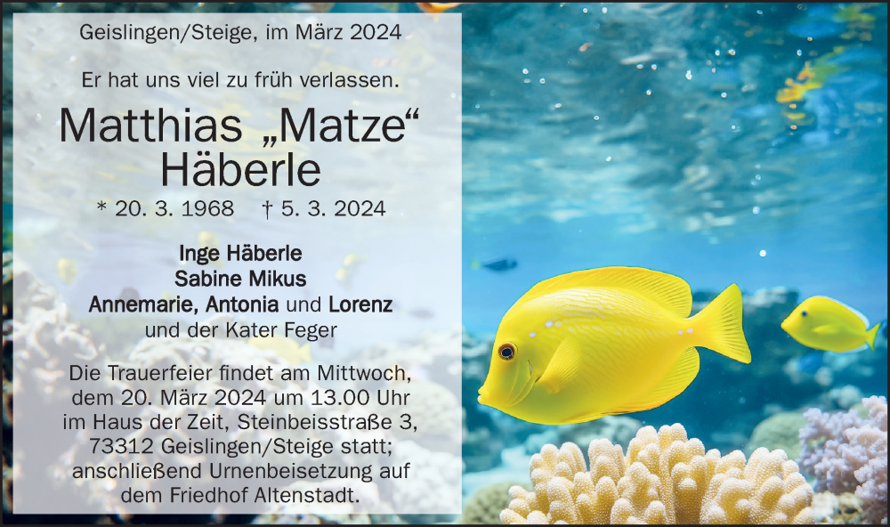 Hier finden Sie alle Traueranzeigen aus der Zeitung, die bisher für Matthias Häberle erschienen sind. Weitere Traueranzeigen, die in der Zeitung erscheinen, werden hier ebenfalls aufgelistet