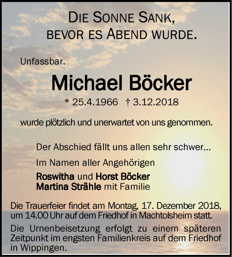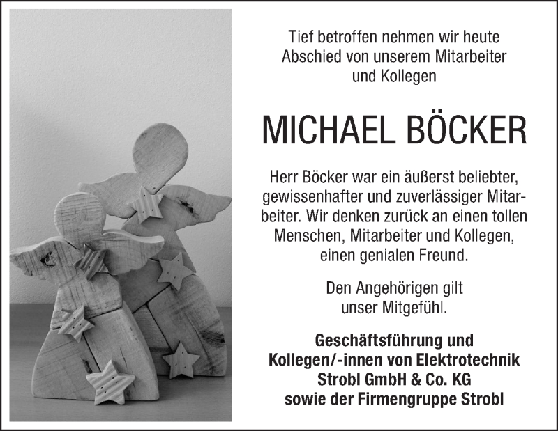Hier finden Sie alle Traueranzeigen aus der Zeitung, die bisher für Michael Böcker erschienen sind. Weitere Traueranzeigen, die in der Zeitung erscheinen, werden hier ebenfalls aufgelistet