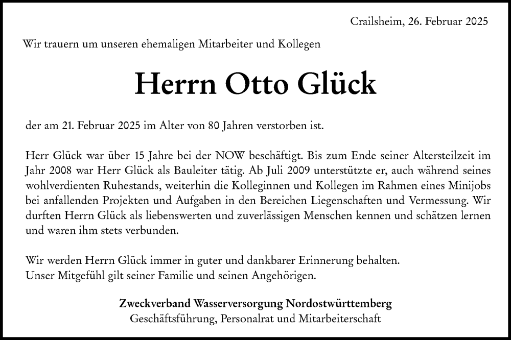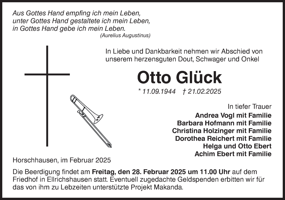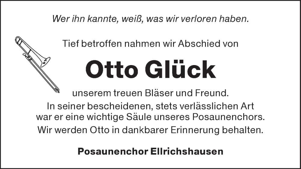 Hier finden Sie alle Traueranzeigen aus der Zeitung, die bisher für Otto Glück erschienen sind. Weitere Traueranzeigen, die in der Zeitung erscheinen, werden hier ebenfalls aufgelistet