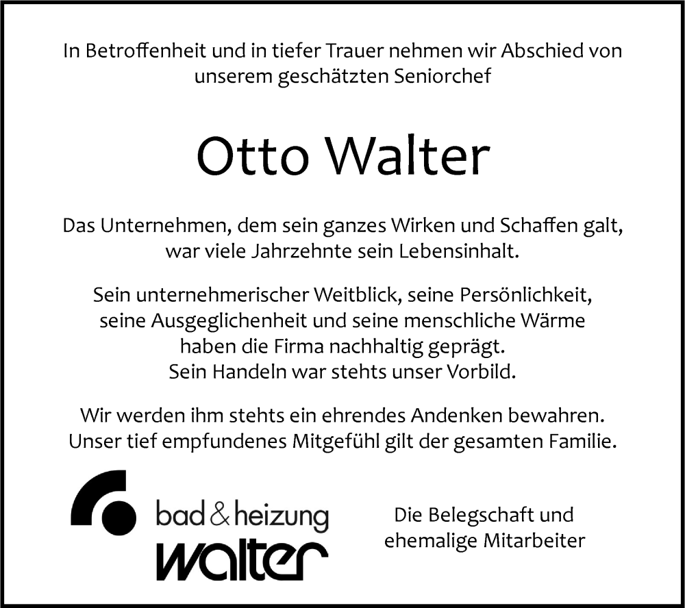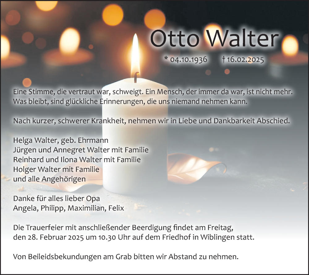 Hier finden Sie alle Traueranzeigen aus der Zeitung, die bisher für Otto Walter erschienen sind. Weitere Traueranzeigen, die in der Zeitung erscheinen, werden hier ebenfalls aufgelistet