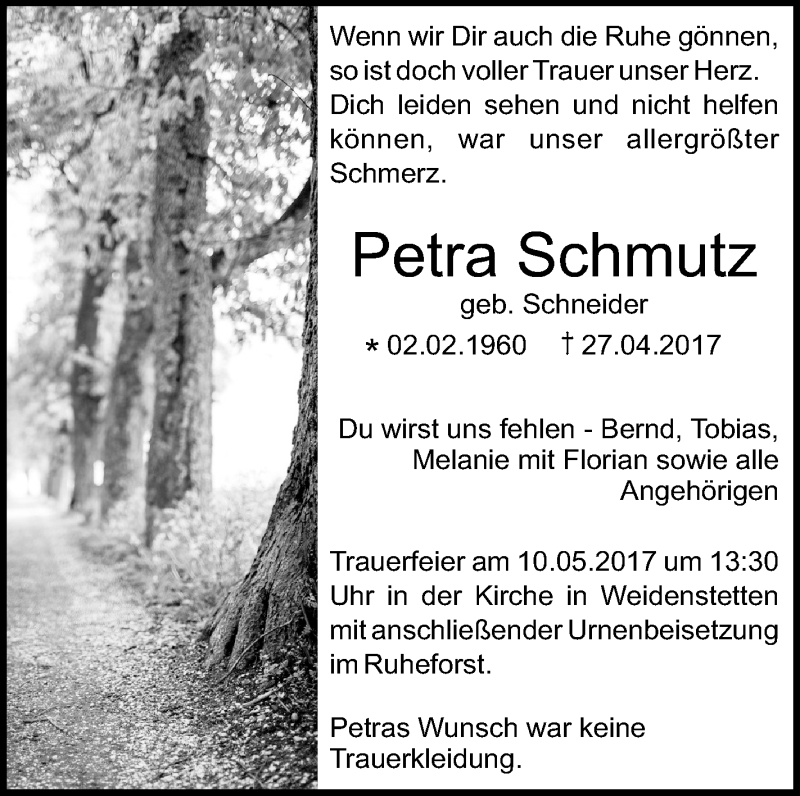 Hier finden Sie alle Traueranzeigen aus der Zeitung, die bisher für Petra Schmutz erschienen sind. Weitere Traueranzeigen, die in der Zeitung erscheinen, werden hier ebenfalls aufgelistet