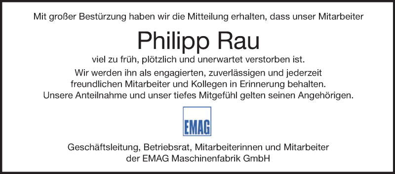 Hier finden Sie alle Traueranzeigen aus der Zeitung, die bisher für Philipp Rau erschienen sind. Weitere Traueranzeigen, die in der Zeitung erscheinen, werden hier ebenfalls aufgelistet