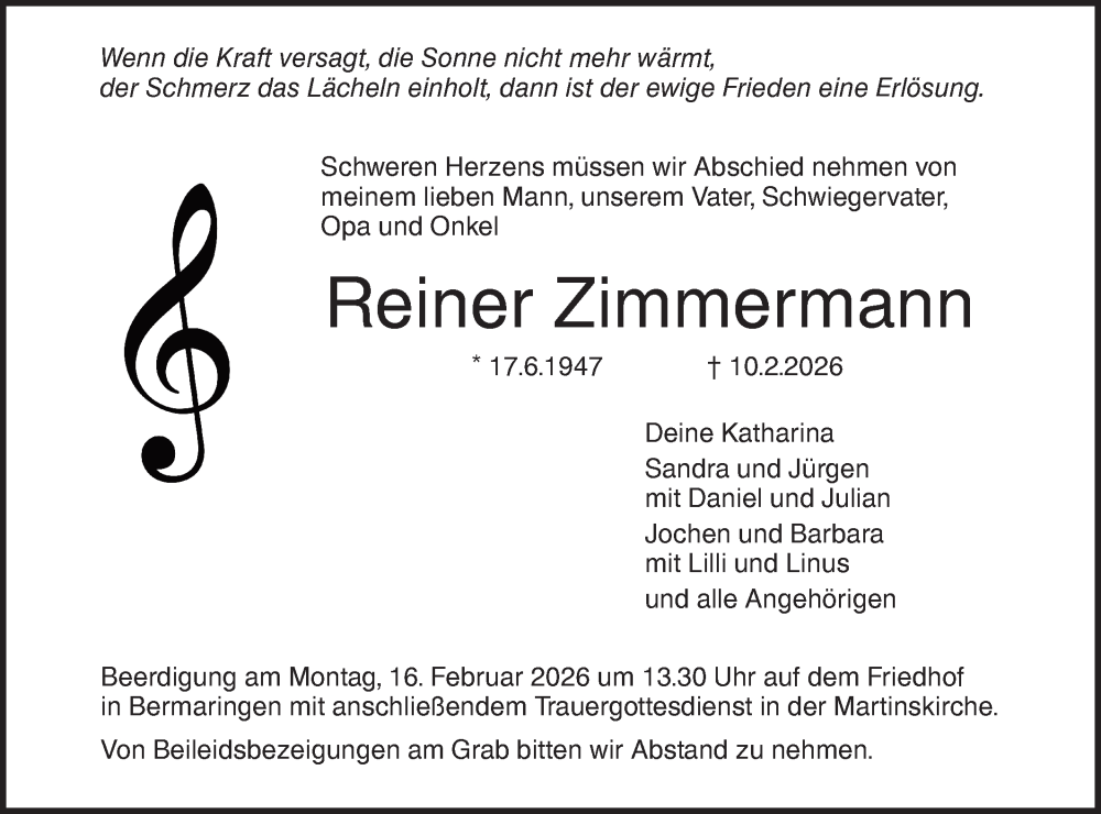 Hier finden Sie alle Traueranzeigen aus der Zeitung, die bisher für Reiner Zimmermann erschienen sind. Weitere Traueranzeigen, die in der Zeitung erscheinen, werden hier ebenfalls aufgelistet