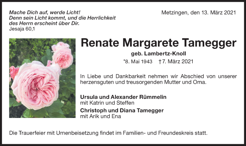 Hier finden Sie alle Traueranzeigen aus der Zeitung, die bisher für Renate Margarete Tamegger erschienen sind. Weitere Traueranzeigen, die in der Zeitung erscheinen, werden hier ebenfalls aufgelistet