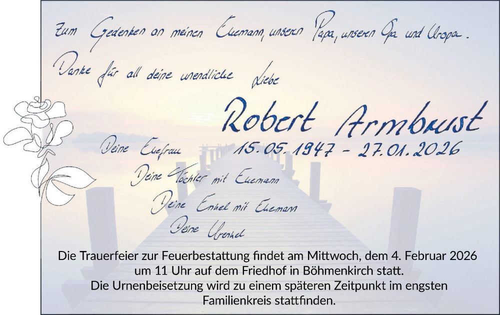Hier finden Sie alle Traueranzeigen aus der Zeitung, die bisher für Robert Armbrust erschienen sind. Weitere Traueranzeigen, die in der Zeitung erscheinen, werden hier ebenfalls aufgelistet