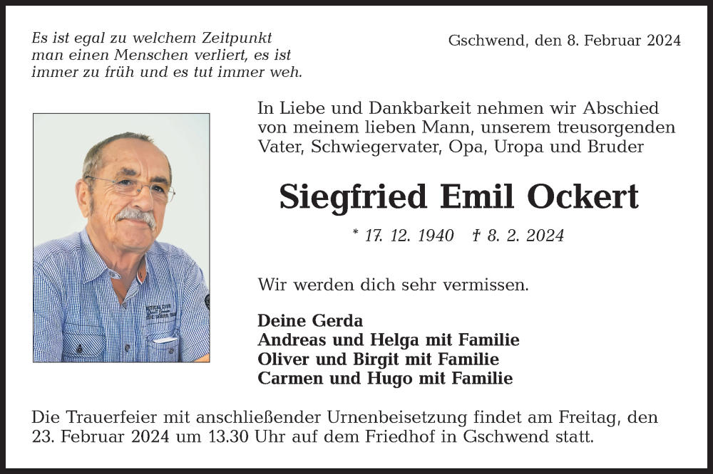 Hier finden Sie alle Traueranzeigen aus der Zeitung, die bisher für Siegfried Emil Ockert erschienen sind. Weitere Traueranzeigen, die in der Zeitung erscheinen, werden hier ebenfalls aufgelistet