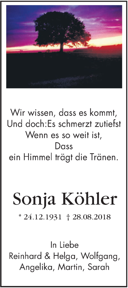 Hier finden Sie alle Traueranzeigen aus der Zeitung, die bisher für Sonja Köhler erschienen sind. Weitere Traueranzeigen, die in der Zeitung erscheinen, werden hier ebenfalls aufgelistet