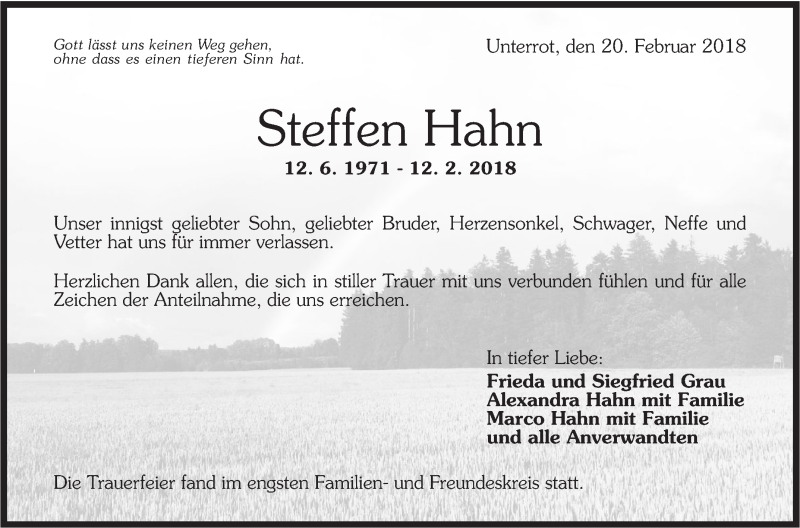 Hier finden Sie alle Traueranzeigen aus der Zeitung, die bisher für Steffen Hahn erschienen sind. Weitere Traueranzeigen, die in der Zeitung erscheinen, werden hier ebenfalls aufgelistet
