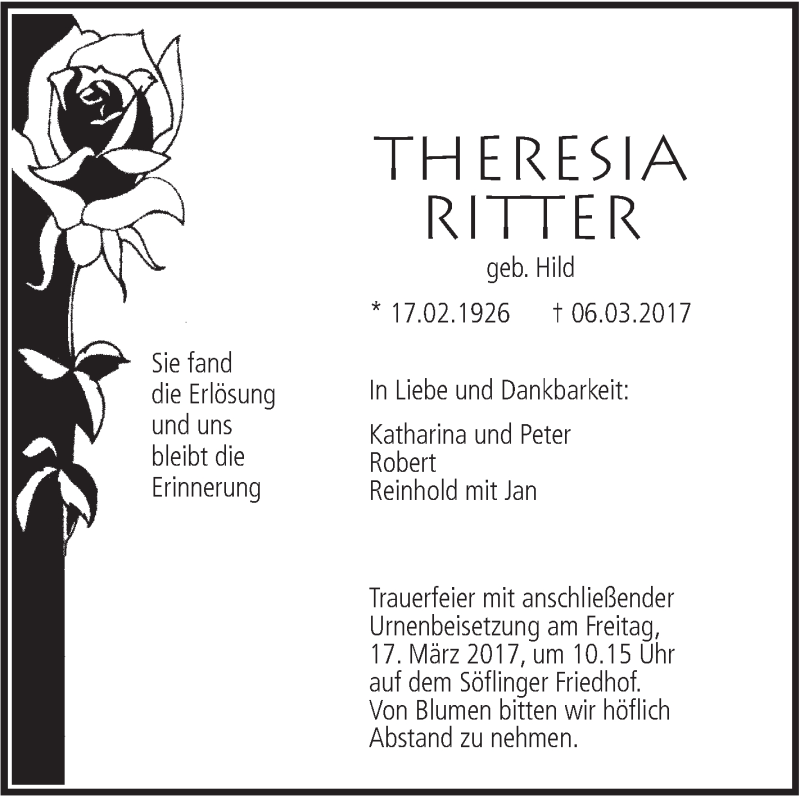 Hier finden Sie alle Traueranzeigen aus der Zeitung, die bisher für Theresia Ritter erschienen sind. Weitere Traueranzeigen, die in der Zeitung erscheinen, werden hier ebenfalls aufgelistet