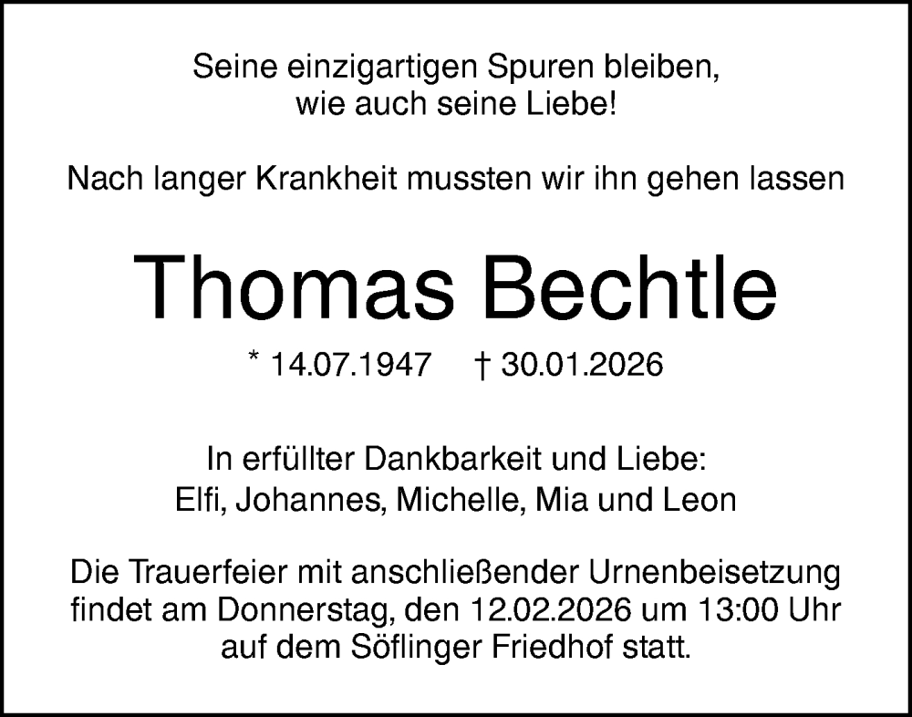 Hier finden Sie alle Traueranzeigen aus der Zeitung, die bisher für Thomas Bechtle erschienen sind. Weitere Traueranzeigen, die in der Zeitung erscheinen, werden hier ebenfalls aufgelistet