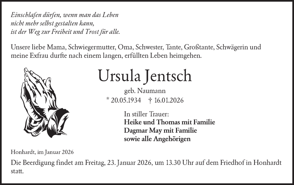 Hier finden Sie alle Traueranzeigen aus der Zeitung, die bisher für Ursula Jentsch erschienen sind. Weitere Traueranzeigen, die in der Zeitung erscheinen, werden hier ebenfalls aufgelistet