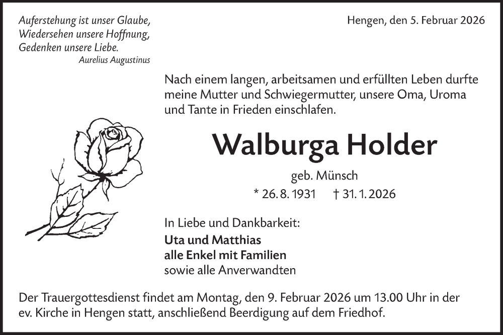Hier finden Sie alle Traueranzeigen aus der Zeitung, die bisher für Walburga Holder erschienen sind. Weitere Traueranzeigen, die in der Zeitung erscheinen, werden hier ebenfalls aufgelistet