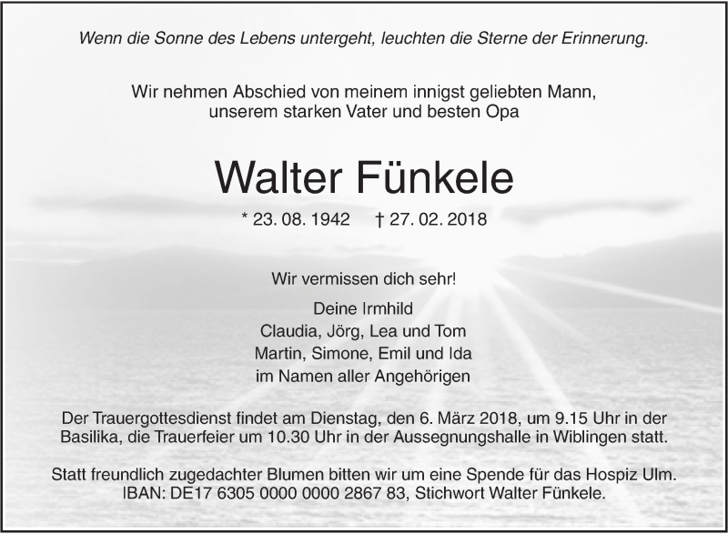 Hier finden Sie alle Traueranzeigen aus der Zeitung, die bisher für Walter Fünkele erschienen sind. Weitere Traueranzeigen, die in der Zeitung erscheinen, werden hier ebenfalls aufgelistet