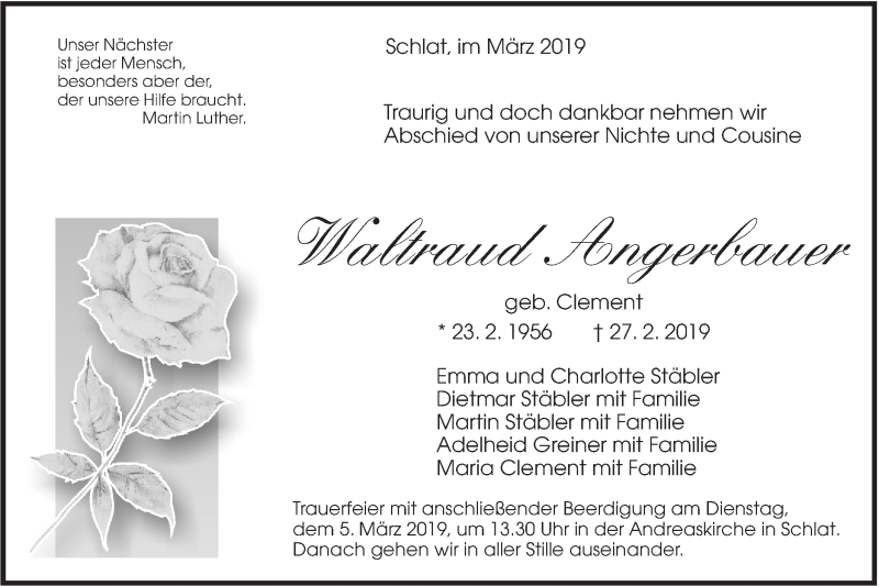 Hier finden Sie alle Traueranzeigen aus der Zeitung, die bisher für Waltraud Angerbauer erschienen sind. Weitere Traueranzeigen, die in der Zeitung erscheinen, werden hier ebenfalls aufgelistet