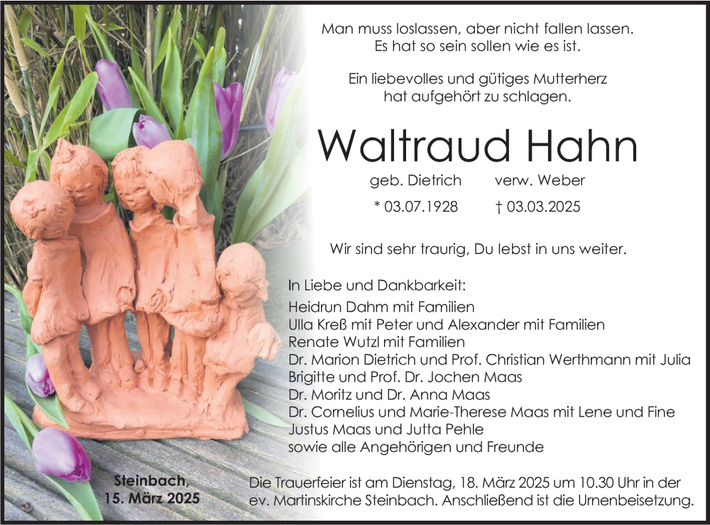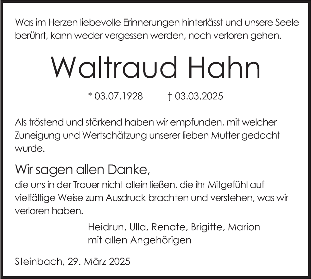 Hier finden Sie alle Traueranzeigen aus der Zeitung, die bisher für Waltraud Hahn erschienen sind. Weitere Traueranzeigen, die in der Zeitung erscheinen, werden hier ebenfalls aufgelistet