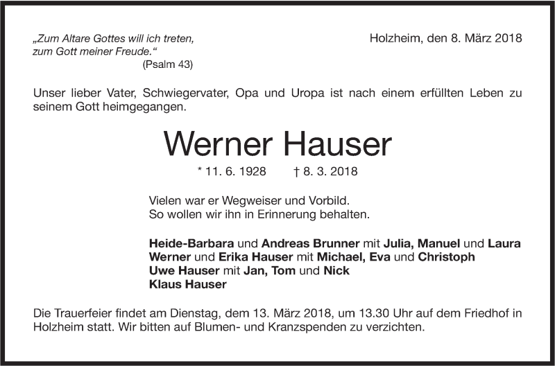 Hier finden Sie alle Traueranzeigen aus der Zeitung, die bisher für Werner Hauser erschienen sind. Weitere Traueranzeigen, die in der Zeitung erscheinen, werden hier ebenfalls aufgelistet