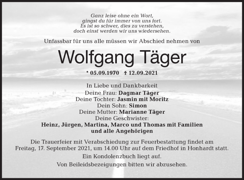 Hier finden Sie alle Traueranzeigen aus der Zeitung, die bisher für Wolfgang Täger erschienen sind. Weitere Traueranzeigen, die in der Zeitung erscheinen, werden hier ebenfalls aufgelistet